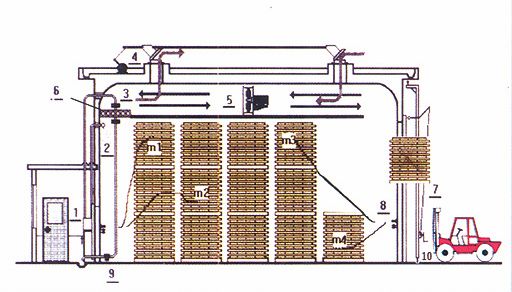 頂風機型干燥窯屬周期式強制循環(huán)干燥窯,風機置于干燥窯頂部,采用耐高溫、高濕電機和防腐鋁壓鑄葉輪組裝在風機架上,并按氣流方向分為正壓區(qū)和負壓區(qū)。風機可正逆定時換向旋轉,氣流隨之改變循環(huán)方向,以此實現(xiàn)了通過材堆的氣流分布均勻而獲得很好的干燥質(zhì)量。